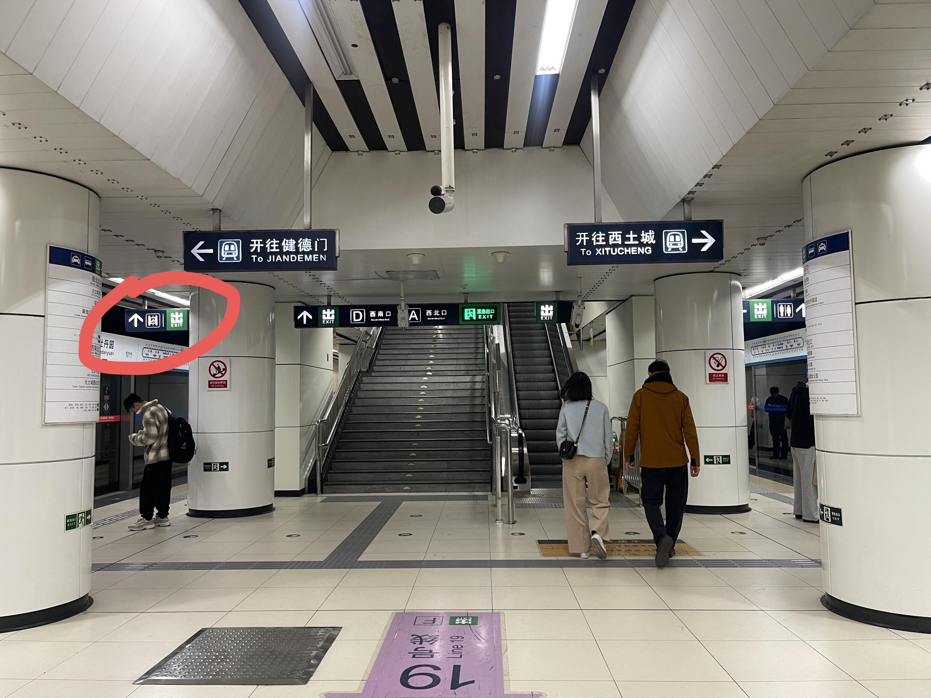 地铁牡丹园站10号线换乘19号线时,藏在柱子斜后方的无障碍电梯指引。