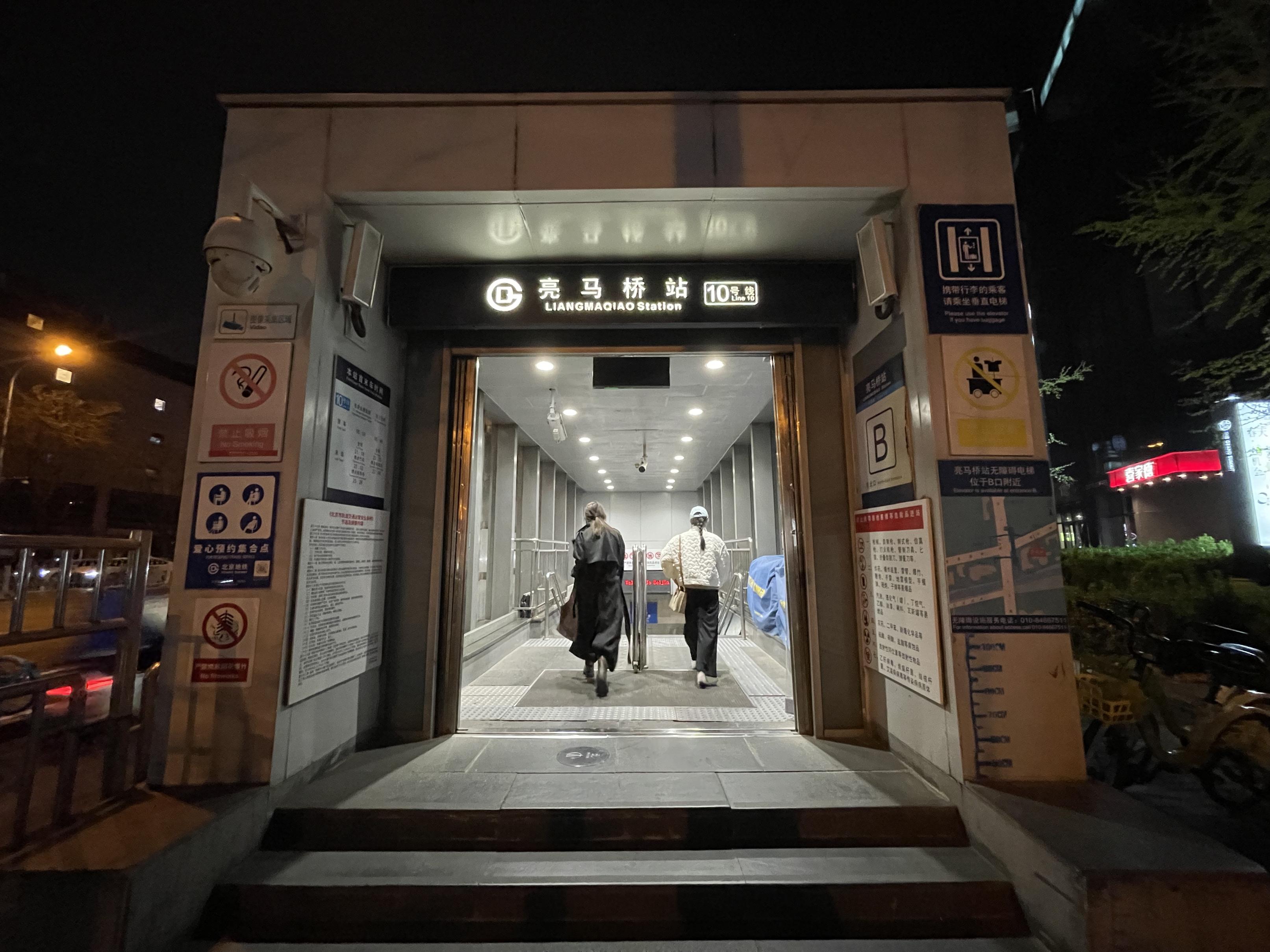 亮马桥站B口无扶梯,地铁口有无障碍电梯提示,显示“位于B口附近”。