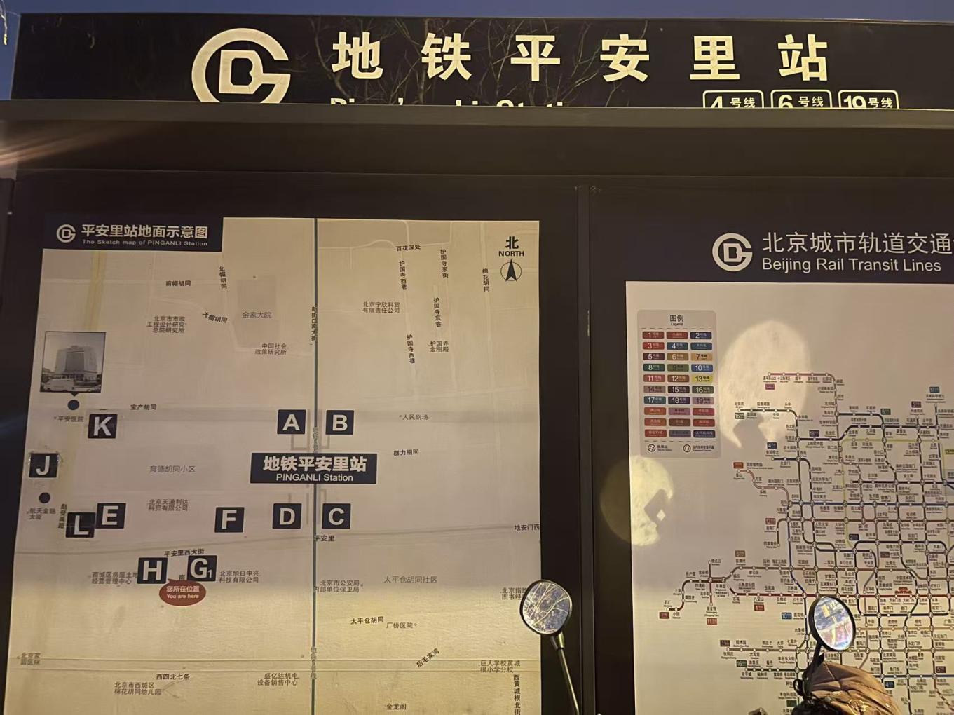记者在多处出入口外均见到了黄女士所说的信息栏,上面标注了11个出入口的位置,却未标明进站扶梯或直梯信息。不过记者留意到,平安里站每个出入口附近均有蓝色的无障碍电梯提示,显示电梯位于B、F、L口附近,并留有服务电话。站口内,侧墙处也有更详细的示意图,标注有直梯信息,但这些位置往往不如站外信息栏醒目,很多乘客并未留意到。至于每个出入口的扶梯情况,记者在站内外未见到任何提示信息。