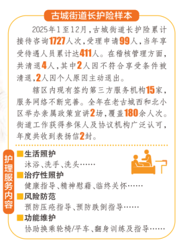 目前,在石景山古城街道所辖的各小区,像王自新这样,申请了长护险的失能家庭,还有不少。数据显示,这几年古城街道长护险服务工作稳步推进。2025年1月至12月,街道层面长护险全年累计接待咨询1727人次,受理申请99人,当年享受待遇人员累计达到411人。